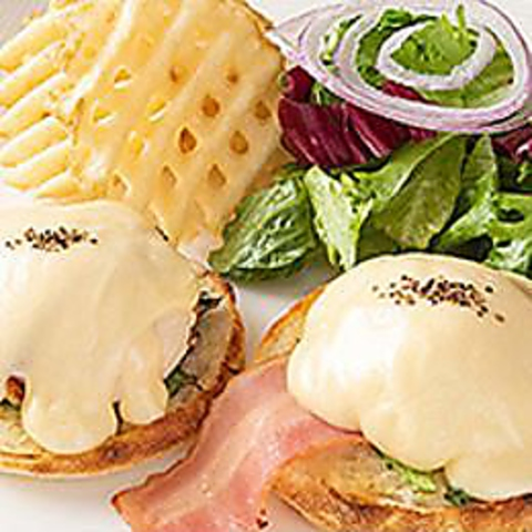 エッグベネディクト トーストしたイングリッシュマフィンに大きめのベーコン、レタス、ポーチドエッグを載せて、白ワイン・バター・ホワイトソース・卵で作ったオランデーズソースをかけました。高倉町珈琲自慢の一品です。※販売時間 終日      1,000円(税込)